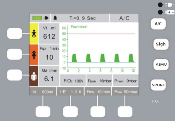 Режимы вентиляции;IPPV, A/C, A/C+Sigh (Вдох), SIMV, SPONT